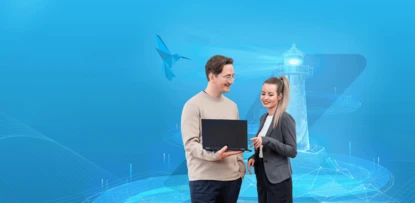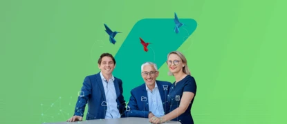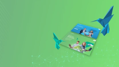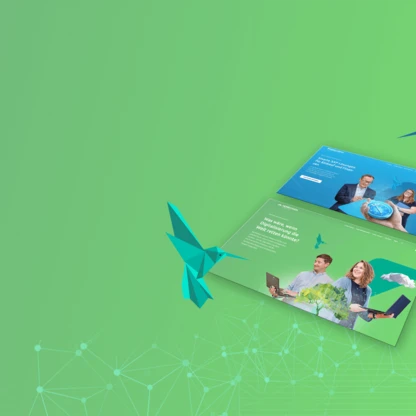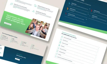 Das seriöse Navy-Blau aus dem Logo findet sich im Design ebenso wieder wie das technische Petrol als Akzentfarbe. Flächen in frischem Apfelgrün und seriösen Bronze runden das Gesamtbild ab. Das Key Visual – der Kolibri in Origami-Optik – steht für die Transformation aus Papier in eine lebendige digitale Welt. Aus dem Signet wurden CD-Elemente mit Rundecken und dynamischer Schräge abgeleitet.