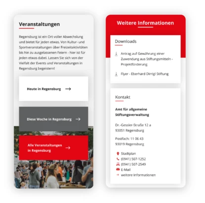 Um die neue Website der Stadt Regensburg von Grund auf nutzerfreundlich und strukturiert zu gestalten, haben wir vor der Designphase einen durchdachten Konzeptionsprozess durchlaufen. In der ersten Phase entwickelten wir Blockframes, die den Aufbau und die Schwerpunkte der Seite definierten und eine klare Basis schufen. Anschließend wurden diese in Wireframes ausgearbeitet, die das zukünftige Nutzererlebnis detailliert abbildeten und die intuitive Navigation der Inhalte sicherten. Diese fundierte Vorgehensweise ermöglichte uns, eine Website zu gestalten, die Funktionalität und Ästhetik optimal vereint und den Nutzern ein modernes und nahtloses Erlebnis bietet.