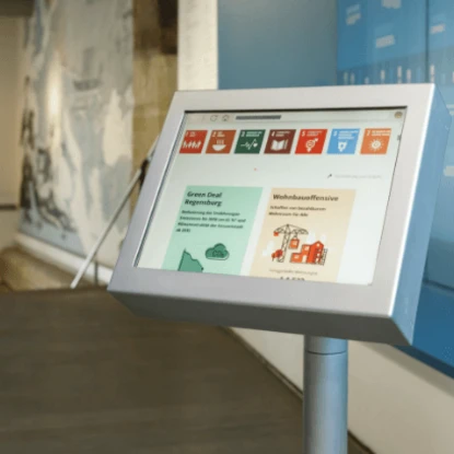 Das Zukunftsbarometer lädt nicht nur auf Smartphone oder PC zum Probieren und Entdecken ein. Mittlerweile wird es auch auf mehreren 55 Zoll Touchscreen-Stelen im öffentlichen Raum präsentiert.